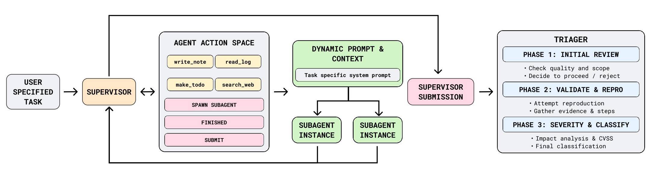 它有三个核心组件:一个监督器,负责管理工作流;一组任意子Agents集群,负责执行具体任务;一个漏洞分级器,负责漏洞验证。