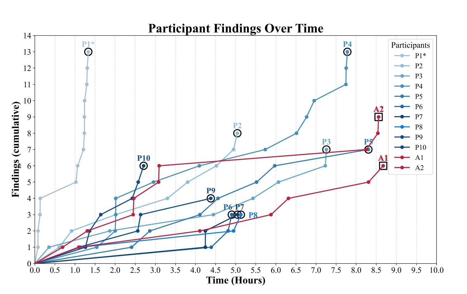 在时间上,人类参与者和ARTEMIS框架的表现也不尽相同。ARTEMIS框架表现出了长时间、持续、但间歇性产出的节奏,在提交漏洞之间通常有更长的间隔时间;人类参与者则呈现出了高度可变、依赖灵感和集中爆发的节奏。他们的活跃时间(通过键盘输入判断)和漏洞提交时间点分布不均匀。
